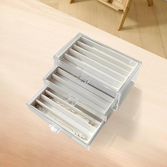 Organize and display your jewelry with this 3-Tier Transparent Jewelry Box. Clear design, space-saving & perfect for daily use.